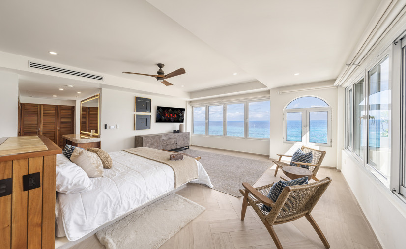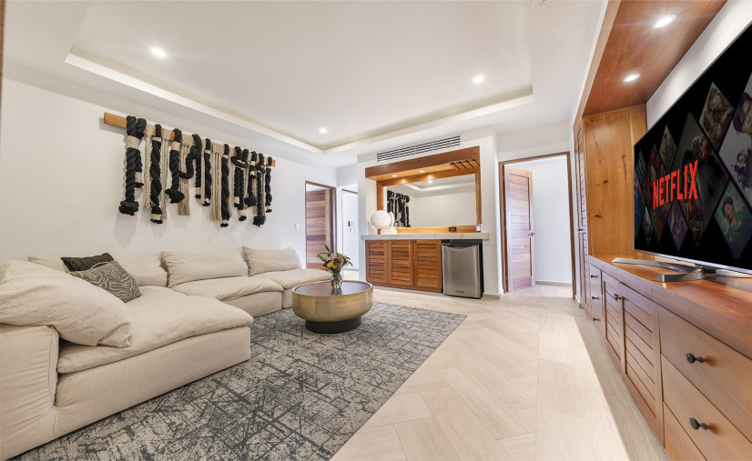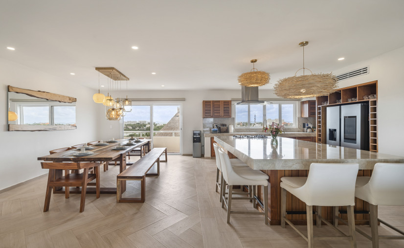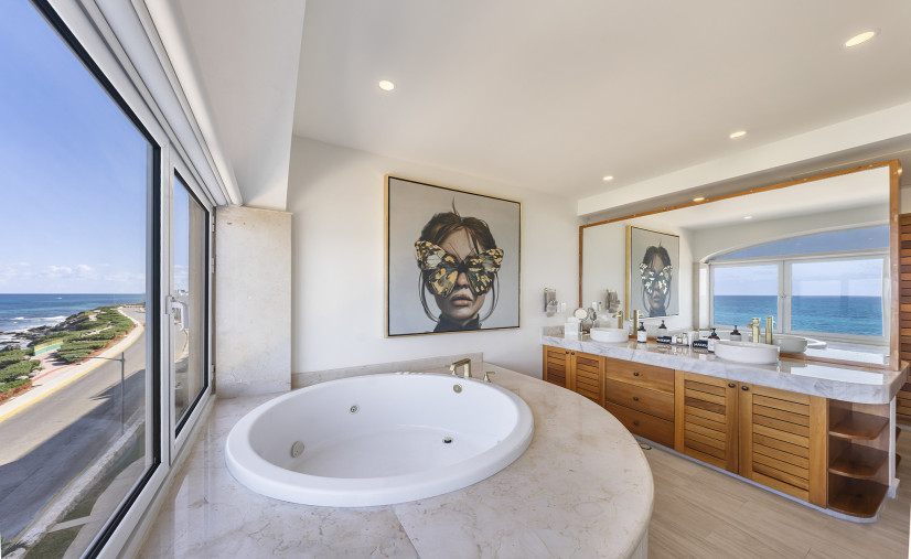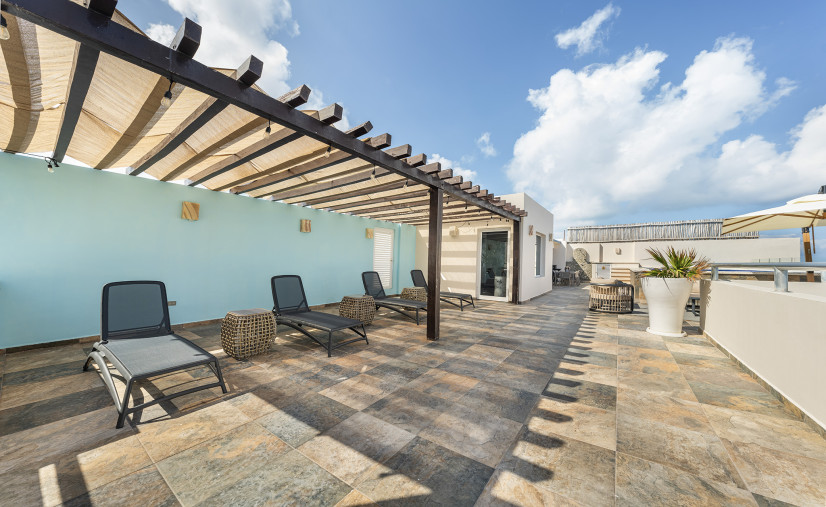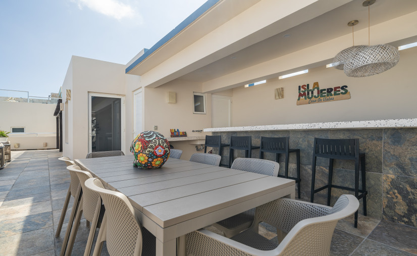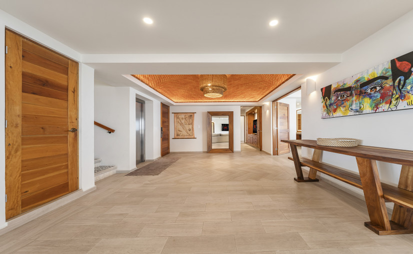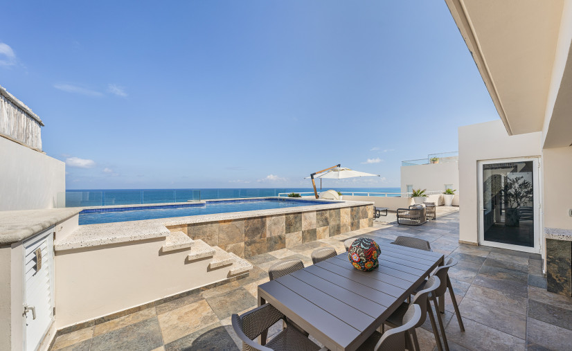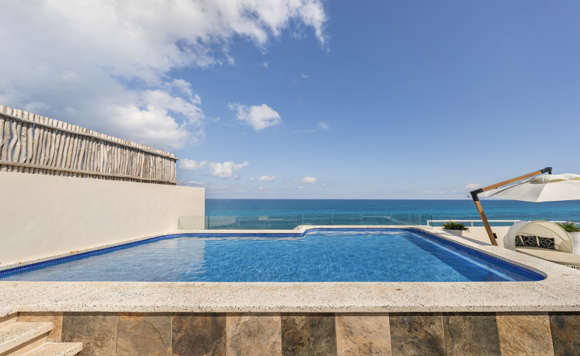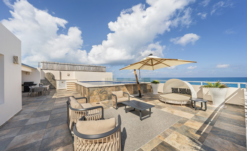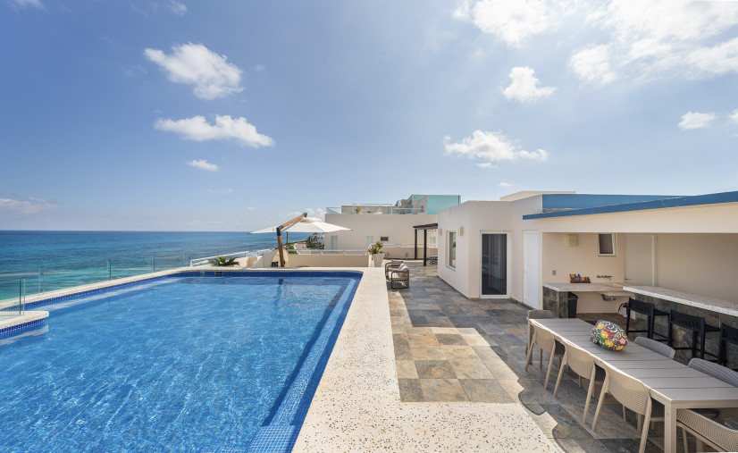 A stairwell or private elevator leads you up to the private rooftop terrace. This spacious area features a large pool and incredible views of the Caribbean Sea. There is a pergola with lounge chairs, an excellent place for soaking up the Mexican sun. There is also a large bar area, mini outdoor kitchen and grill which makes this spot the perfect place for entertaining.