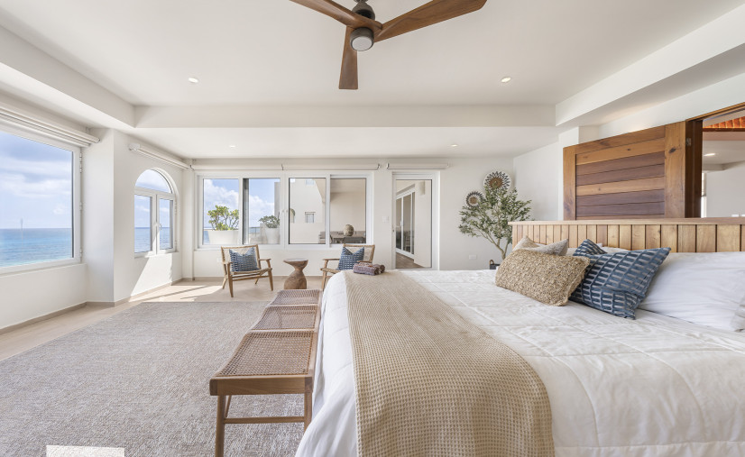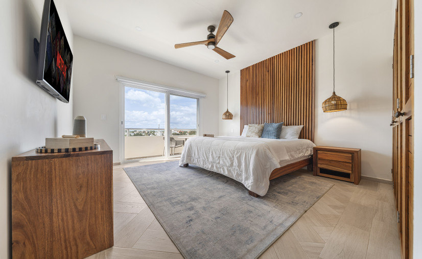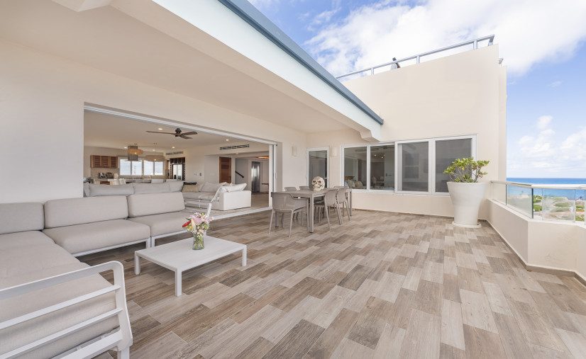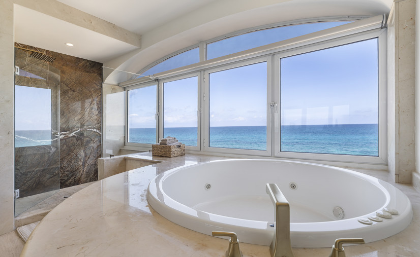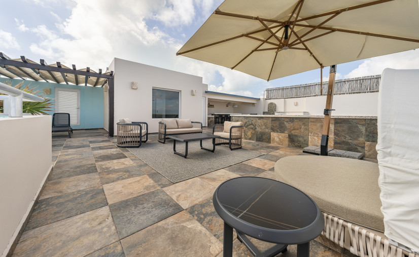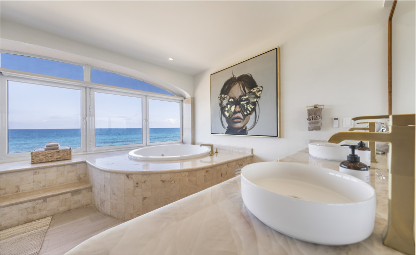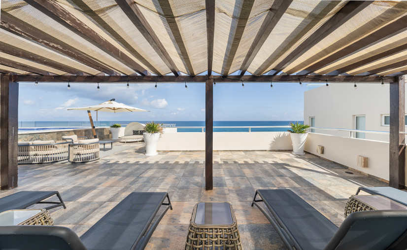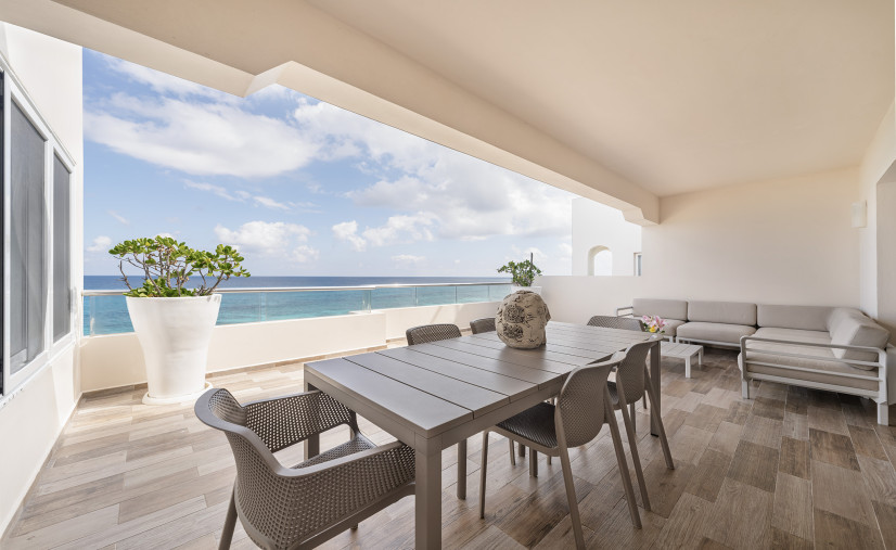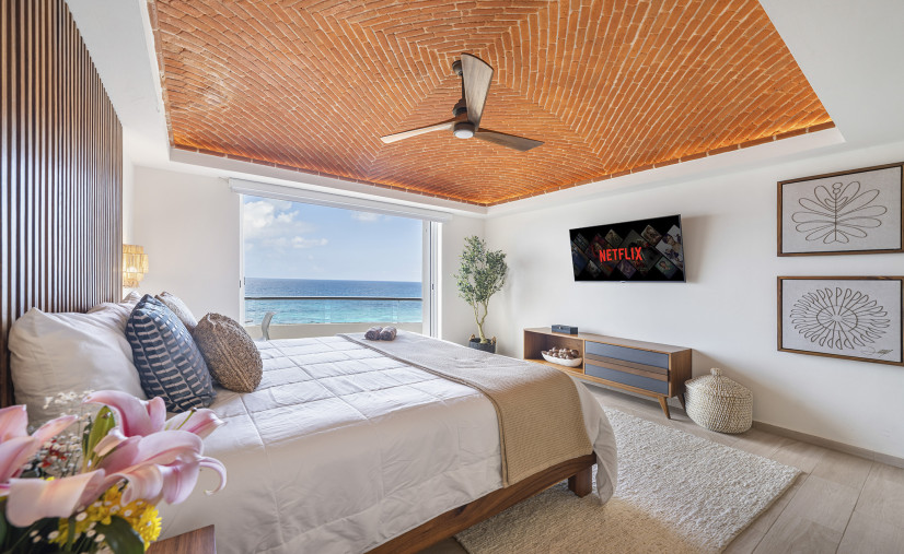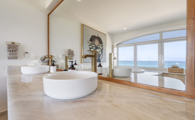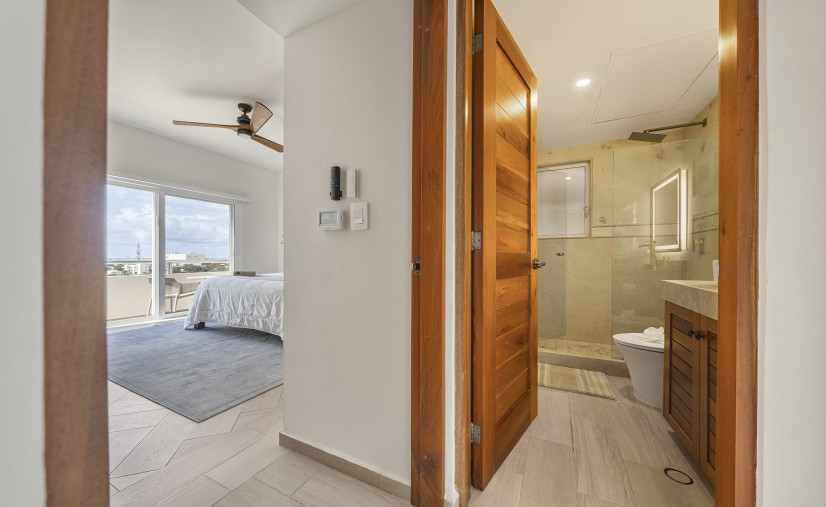 A stairwell or private elevator leads you up to the private rooftop terrace. This spacious area features a large pool and incredible views of the Caribbean Sea. There is a pergola with lounge chairs, an excellent place for soaking up the Mexican sun. There is also a large bar area, mini outdoor kitchen and grill which makes this spot the perfect place for entertaining.
