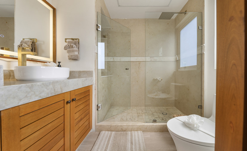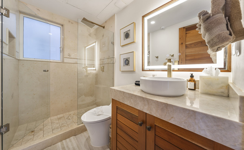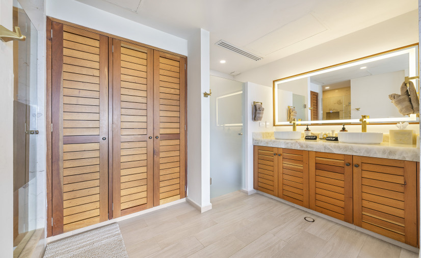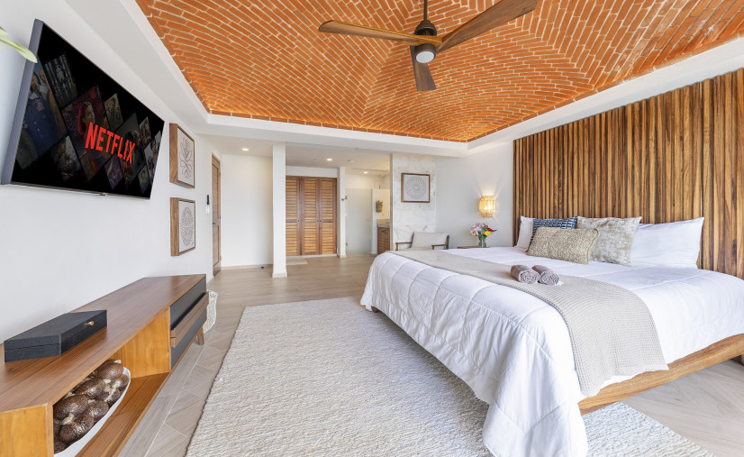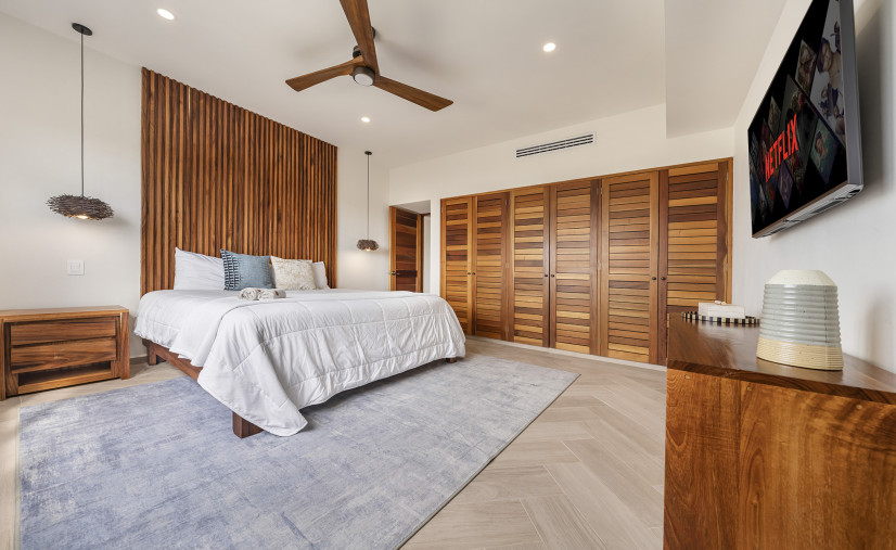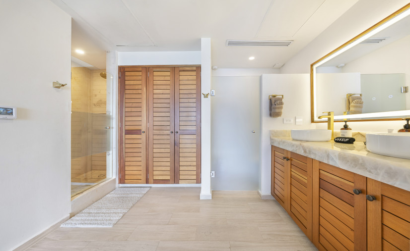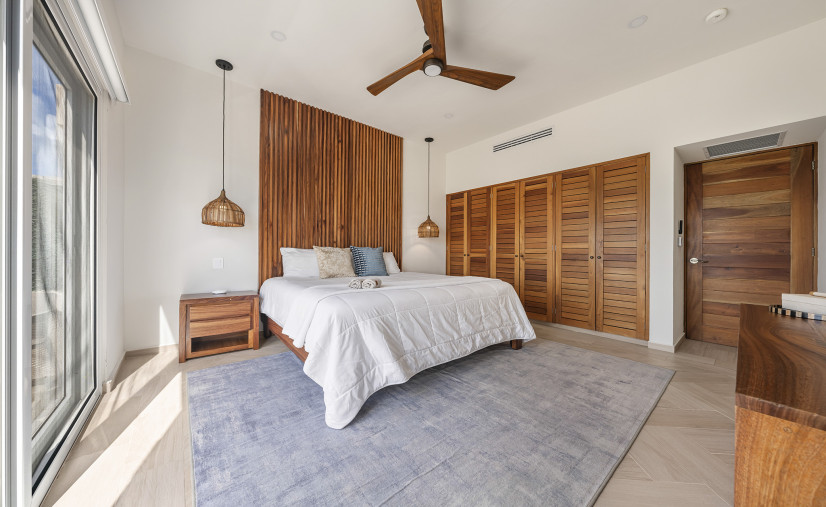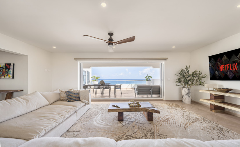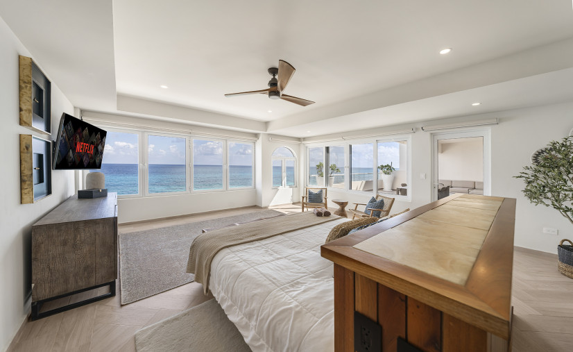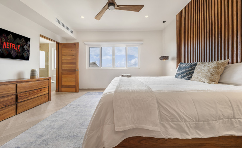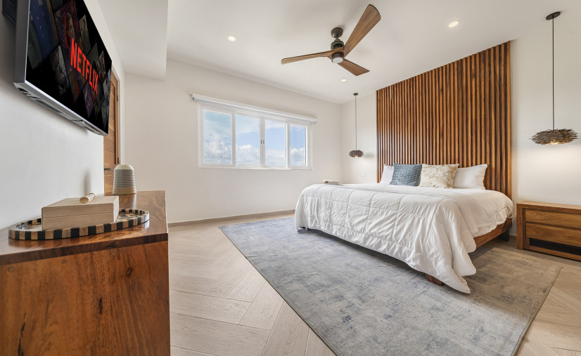 A stairwell or private elevator leads you up to the private rooftop terrace. This spacious area features a large pool and incredible views of the Caribbean Sea. There is a pergola with lounge chairs, an excellent place for soaking up the Mexican sun. There is also a large bar area, mini outdoor kitchen and grill which makes this spot the perfect place for entertaining.